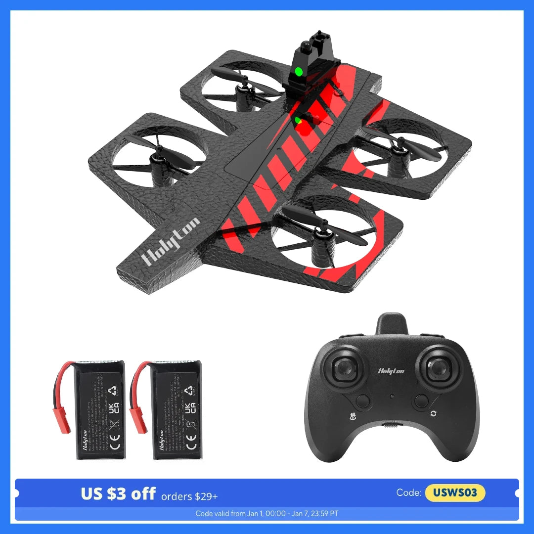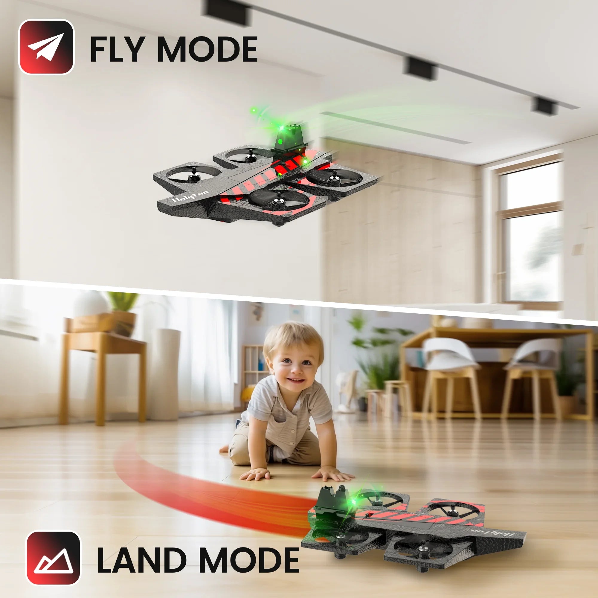 2 IN 1 DESIGN:Experience the thrill like never before with our innovative 2-in-1 design that seamlessly merges the excitement of a toy car with the exhilaration of a drone. Get ready to dominate both the road and the sky in one unforgettable adventure!Picture yourself racing at lightning speed on the road one moment, and then effortlessly transforming into a high-flying drone the next. The possibilities are endless as you seamlessly switch between ground and aerial maneuvers, leaving ordinary playtime far behind.Experience the joy of a new era in playtime innovation. Elevate your racing aspirations and soar to new heights with the ultimate 2-in-1 Drone Airplane and Toy Car. Unleash the boundless possibilities that await when you seamlessly merge the realms of land and air. Get ready to transform, race, and fly - all in one incredible package!